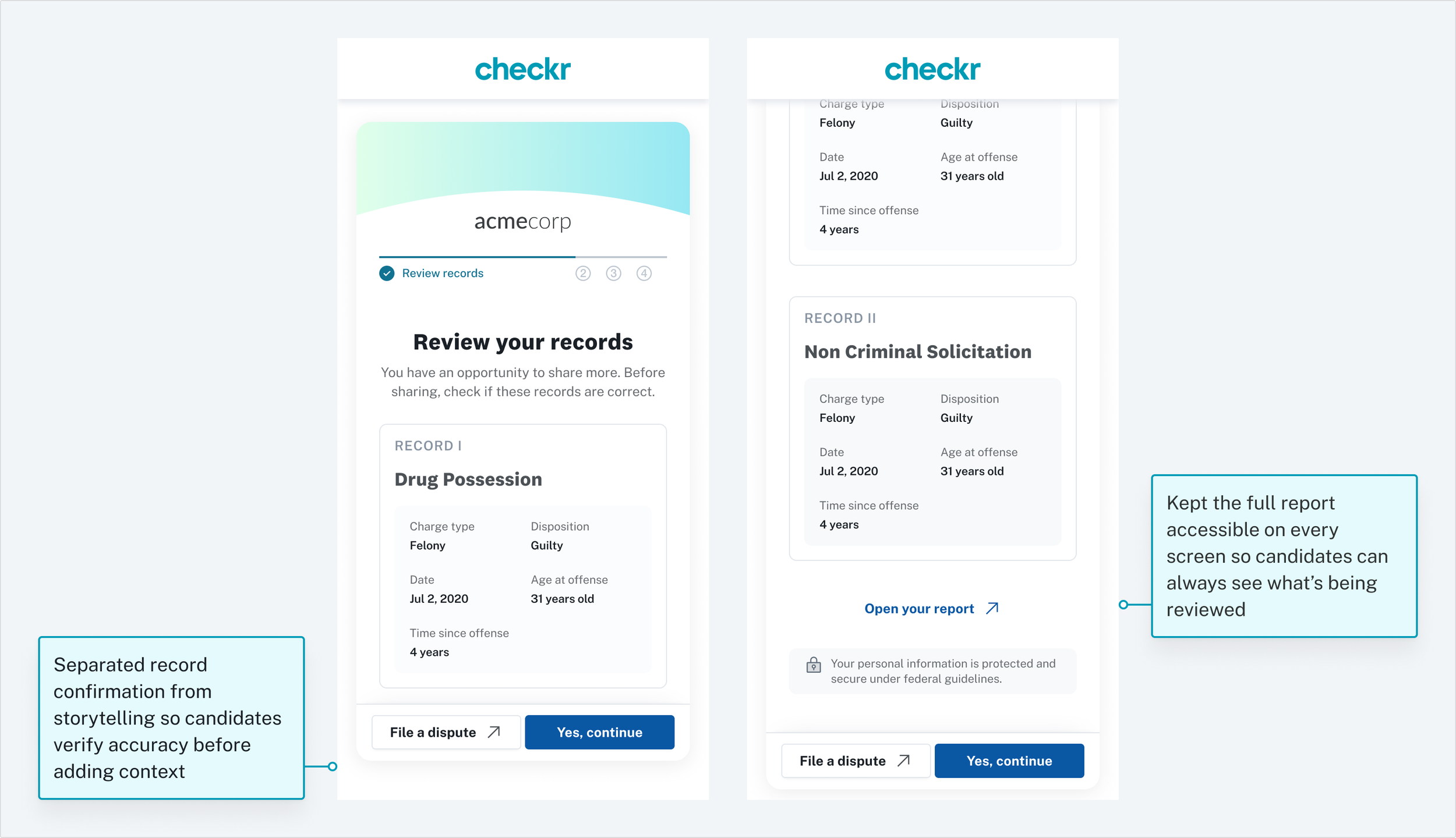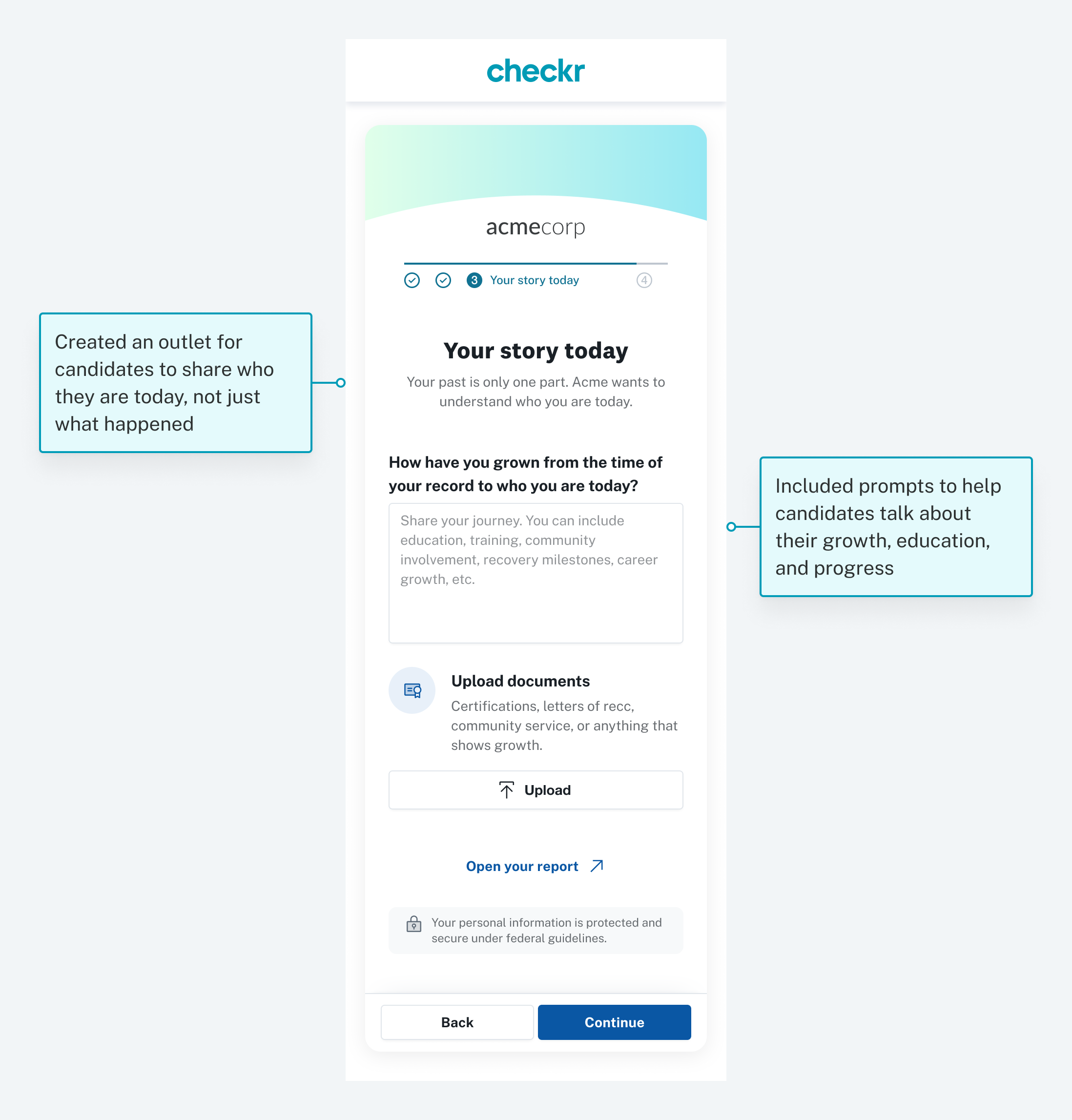 Through the structured design sprint, we thought of creating a form for a candidate to contextualize their background check results and provide positive information about themselves that an employer could easily review.