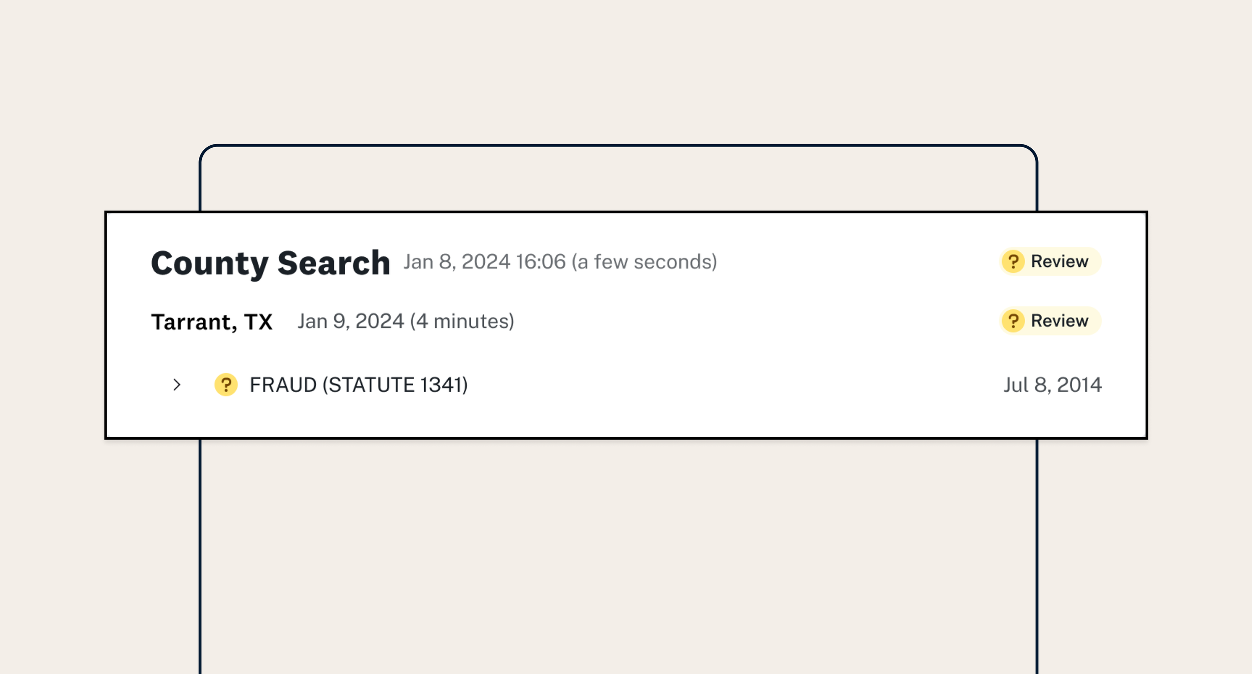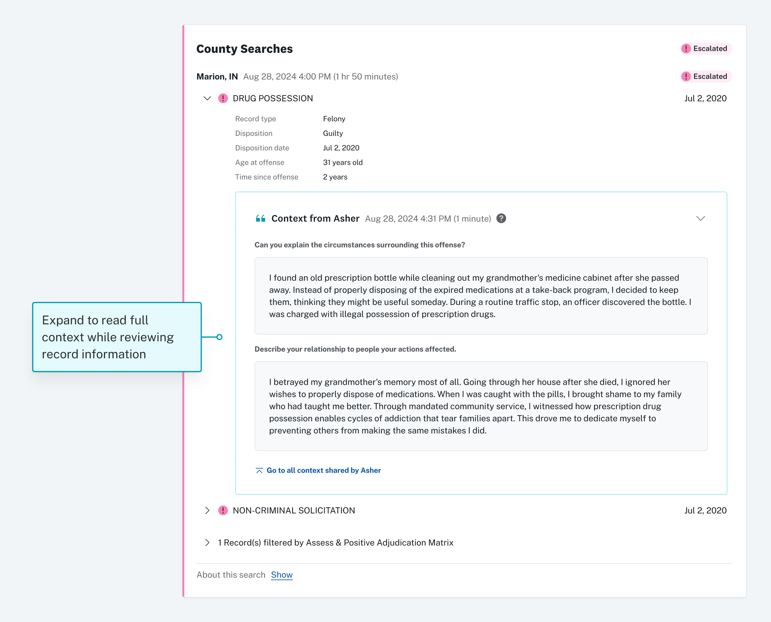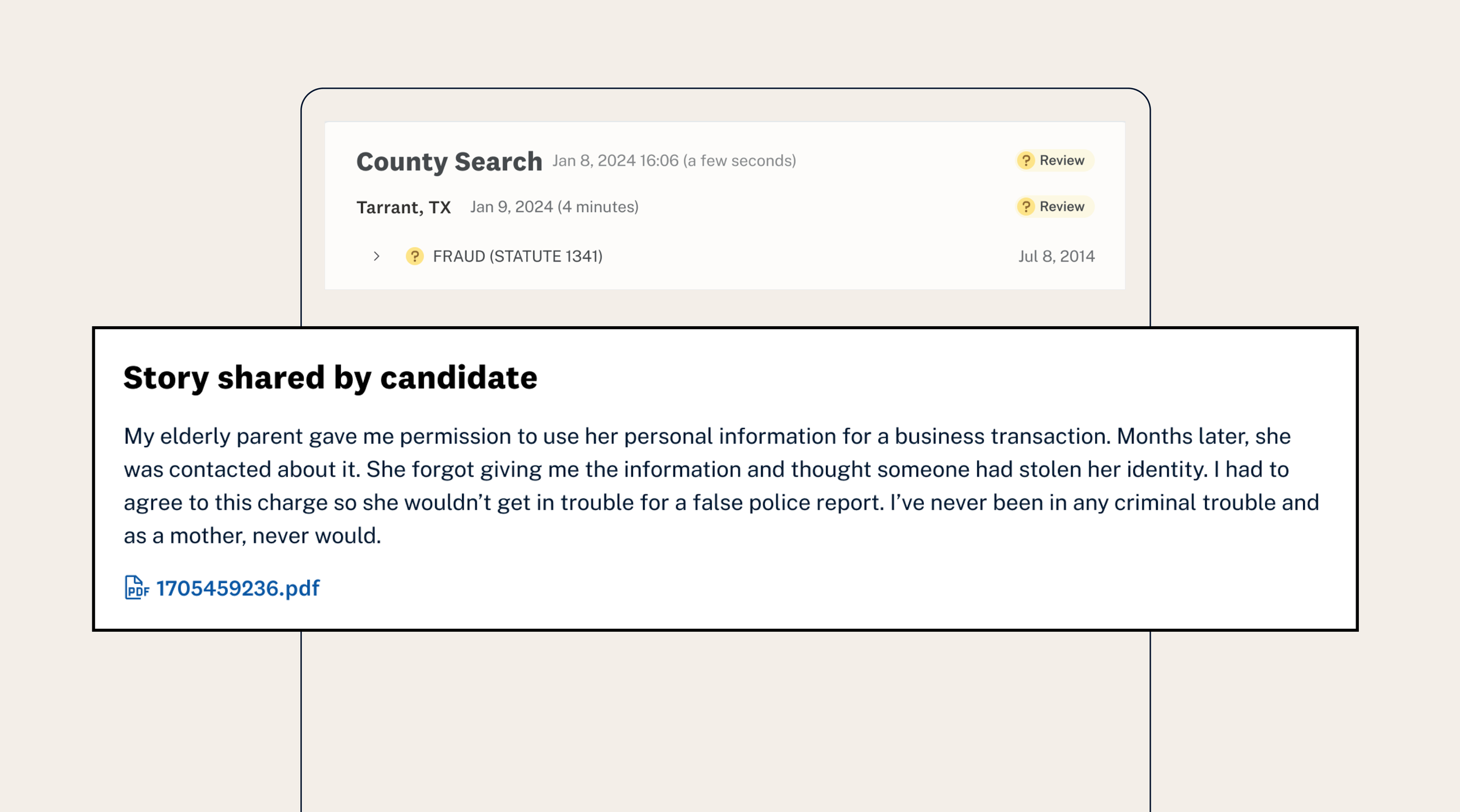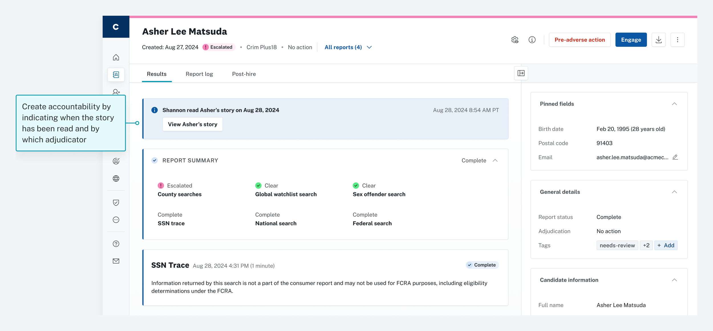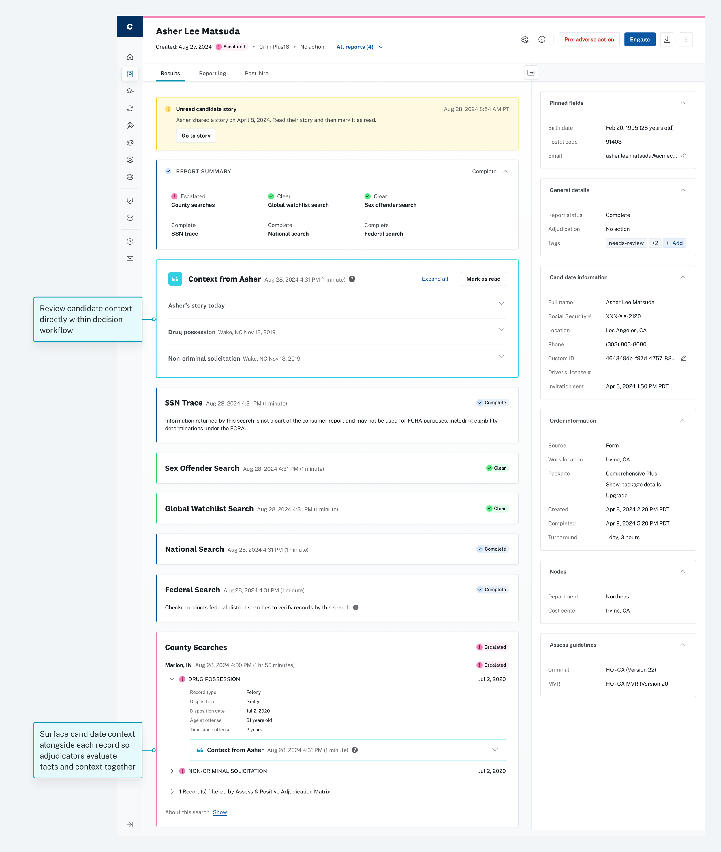The story appears directly on the background check in-context with where decisions are made.