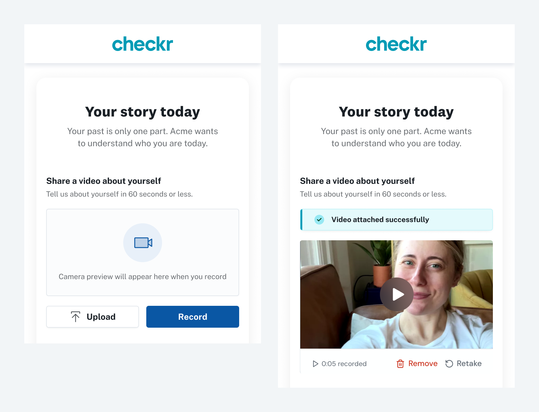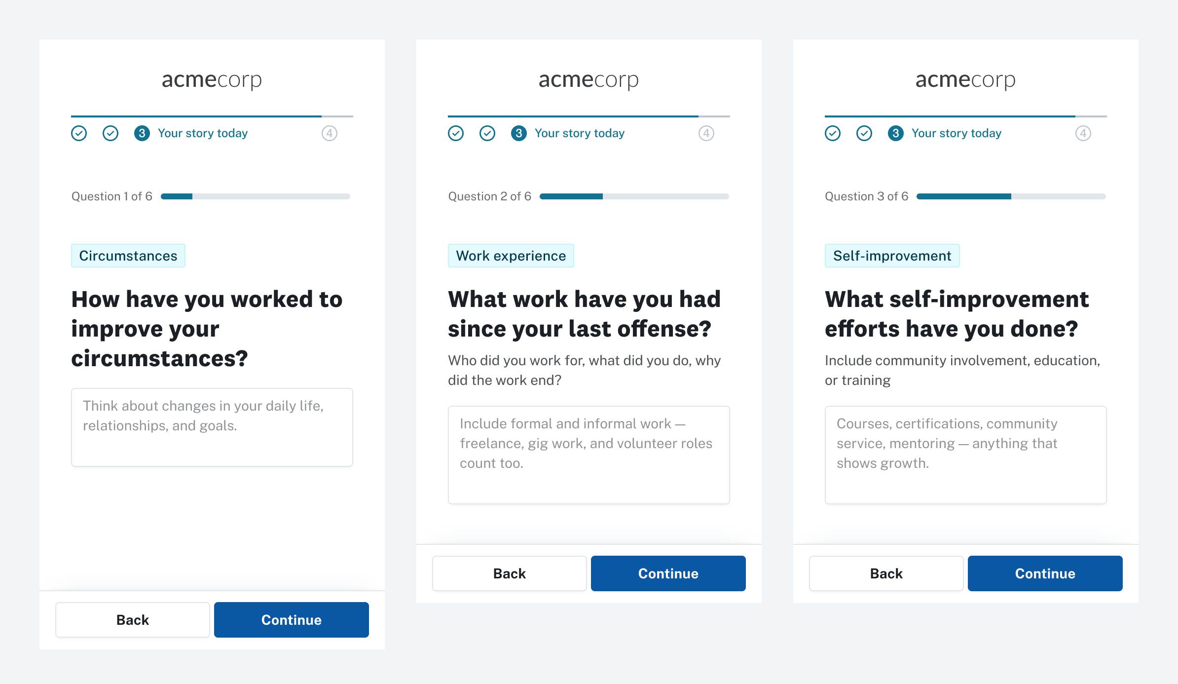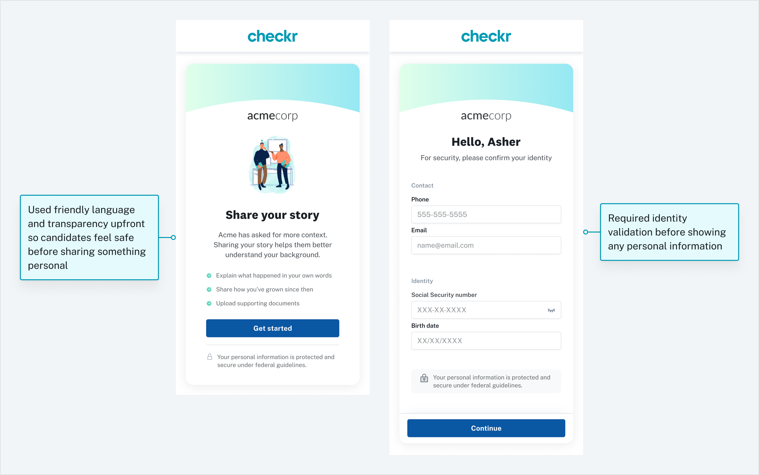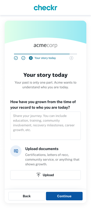 Criminal records can be challenging to interpret, and context around the same charge can be different between individuals. Candidate Stories gives candidates the opportunity to speak about their conviction and how they’ve grown since. Since many candidates complete their background checks on their phones, I wanted to design a mobile-optimized experience.