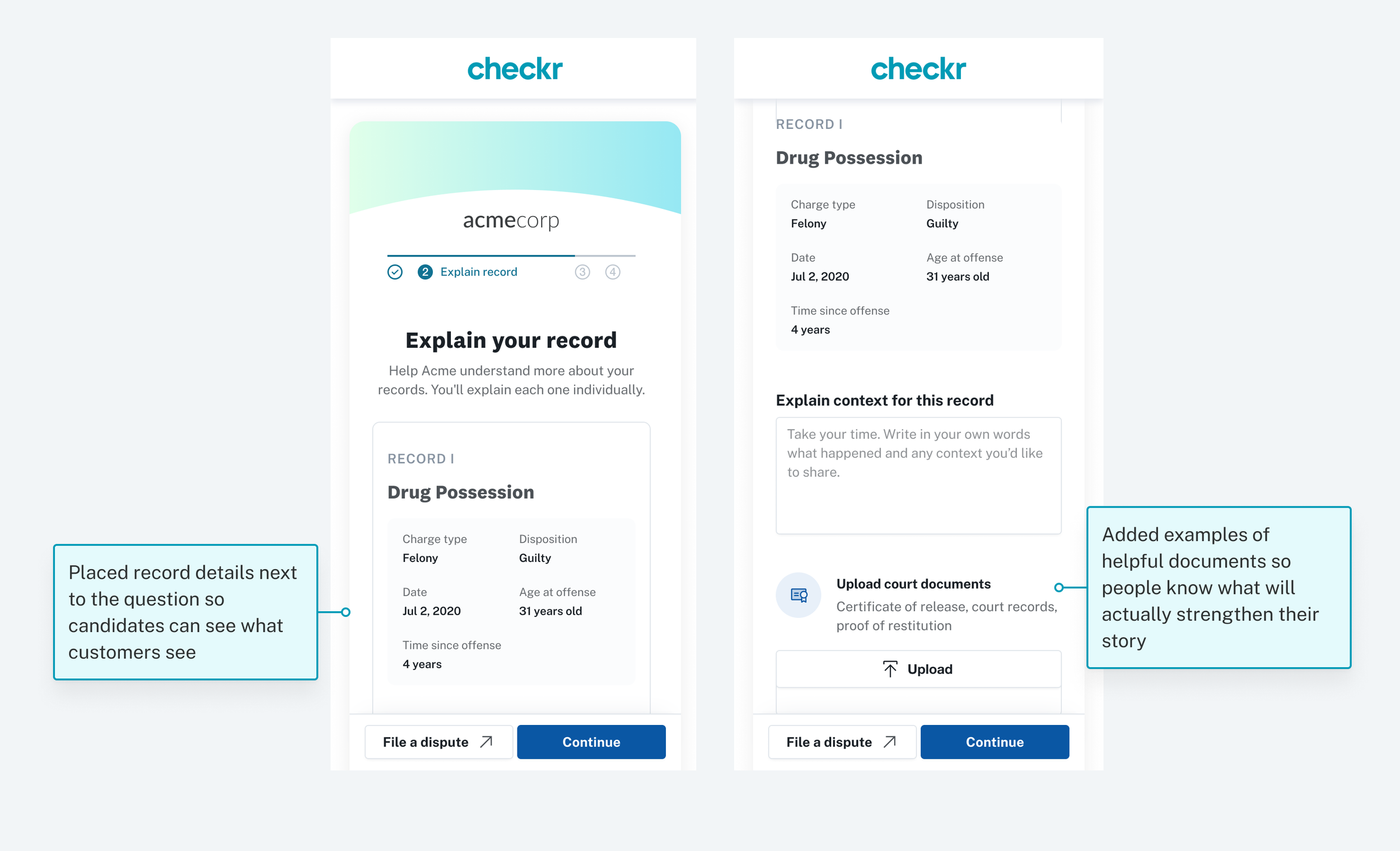 I built and led a cross-functional team to help adjudicators (background check decision-makers) see the human behind the check. I designed a flow, Candidate Stories, that lets candidates (job-seekers) provide context and evidence of rehabilitation directly on their background check.